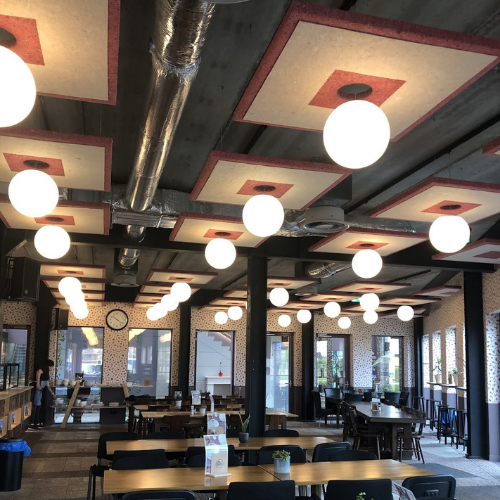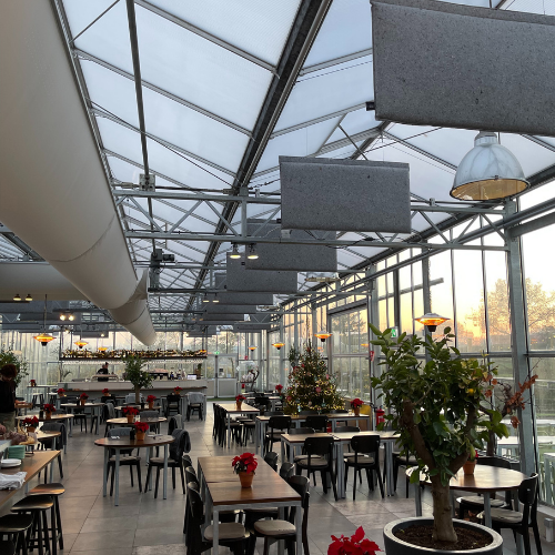 Stadsjochies in een Utrechts restaurant gevestigd in een grote glazen kas. Om de akoestiek te verbeteren is gekozen voor baffles in Cloud Grey.