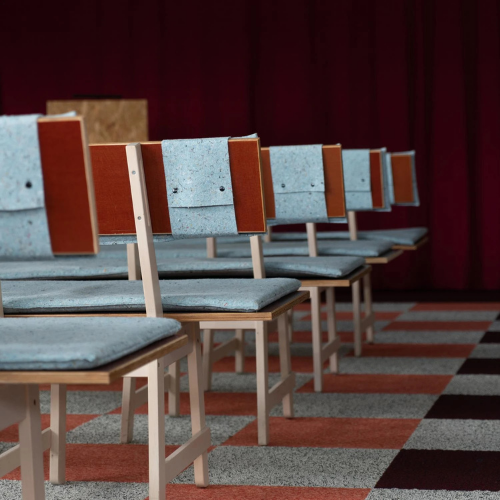 In het gebouw van Firma van Buiten is veel gebruik gemaakt van tweedehands meubels en hergebruikte materialen, zoals i-felt in de kleur Efteling Fairy Blue.