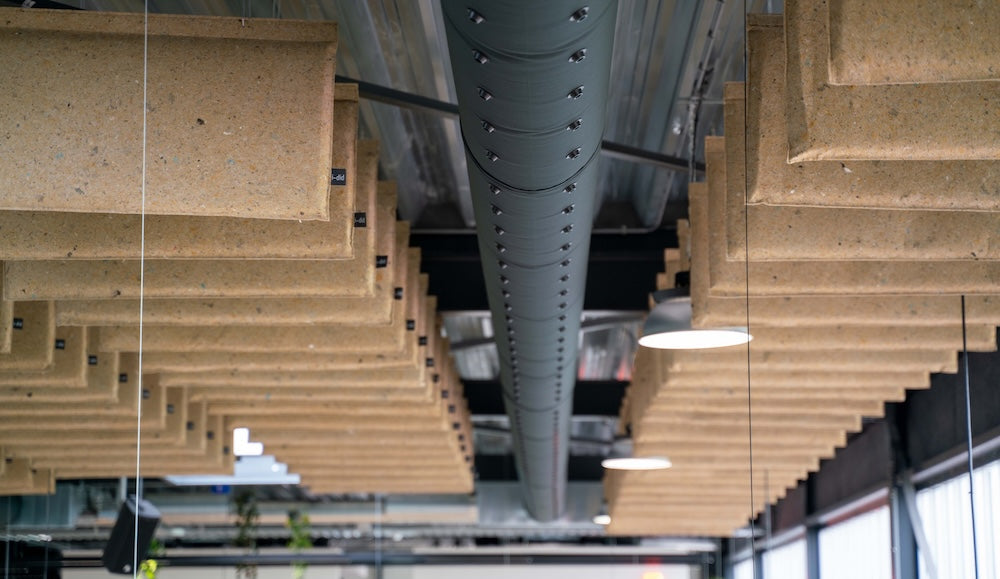 In het pand vind je verschillende akoestische mogelijkheden zoals baffles, lampenkappen en POD's van gerecycled textiel. De items zijn kenmerkend voor het industriële en karakteristieke pand van DHM: “Alles krijgt hier een tweede leven.”
