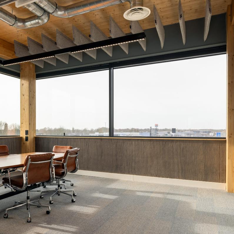 Houtlab is een duurzaam, circulair en inspirerend gebouw waarin samenwerking voorop staat. In verschillende ruimtes werd gekozen voor akoestische baffles en panelen van i-did in de kleur Cloud Grey. Concept en design: Leidmotiv.