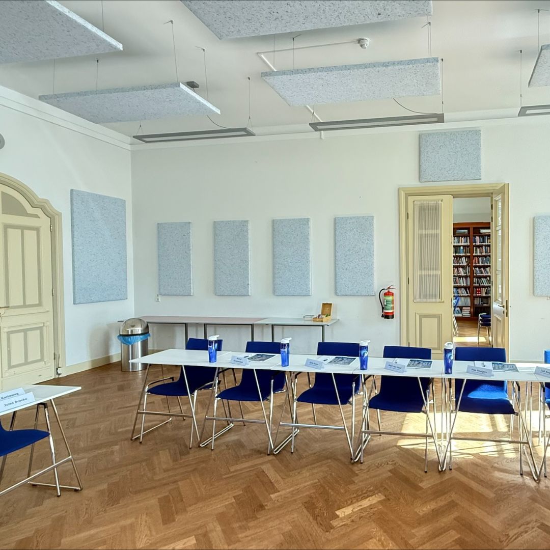 i-did dacht mee over de inrichting van meerdere vergaderzalen en de ontvangstruimte van dit monumentale pand. We plaatsten: kamerschermen, plafond- en wandpanelen in twee kleuren voor meer rust en comfort.