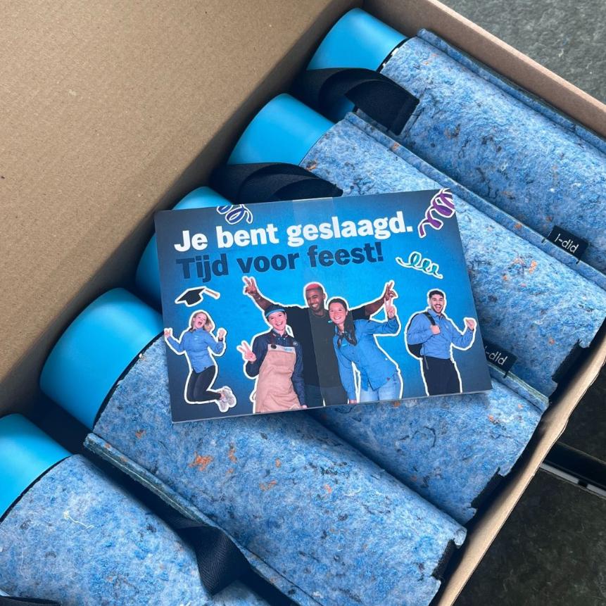 De geslaagde vakkenvullers bij Albert Heijn krijgen een duurzame waterfles van Made Blue in een sleeve van gerecyclede bedrijfskleding van Albert Heijn.