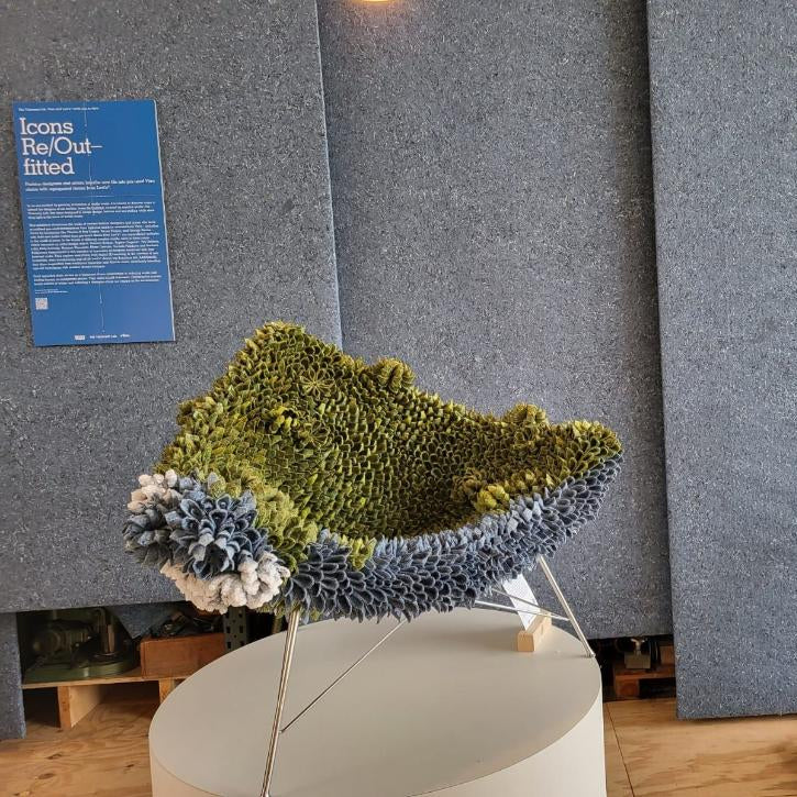 Een waanzinnige presentatie van ons vilt tijdens de Icons Re/Outfitted op Dutch Design Week. The Visionary Lab nodigde modeontwerpers uit om iconische, gebruikte Vitra stoelen nieuw leven in te blazen met hergebruikt Levi’s denim.