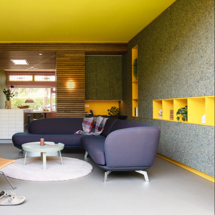 In het duurzame kantoorpand van Domesta is gekozen voor gebruikte of bestaande producten en herwonnen of circulaire grondstoffen zoals vilt in de kleur Efteling Golden Touch als akoestische toepassing.