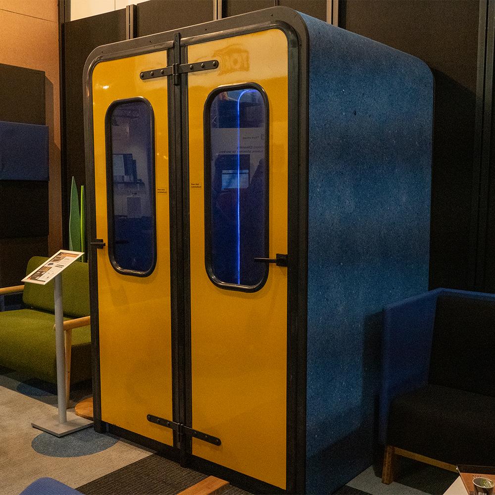 Opnieuw, gespecialiseerd in 100% circulaire kantoormeubels, past ons vilt regelmatig toe in verschillende projecten. Zo is deze belcel, gemaakt van oude treindeuren van de NS, bekleed met ons vilt in KLM Sky Blue.