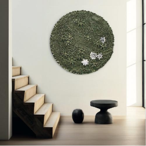 Wasteland collection door Tim Dekkers - design. Gebaseerd op ons akoestische eiland en bekleed met meer dan 1000 gelaserde driehoekjes in Defence Green. Het ontwerp was te zien tijdens Salone Milano 2024.