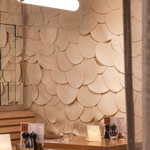 Voor dit restaurant in Londen heeft architectenbureau Overtreders W gekozen voor een unieke wandbekleding van vilt. Met onze laser zijn verschillende vormen uitgesneden die aan de wand zijn bevestigd.